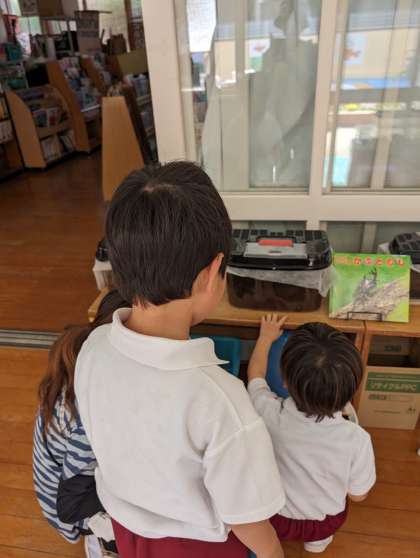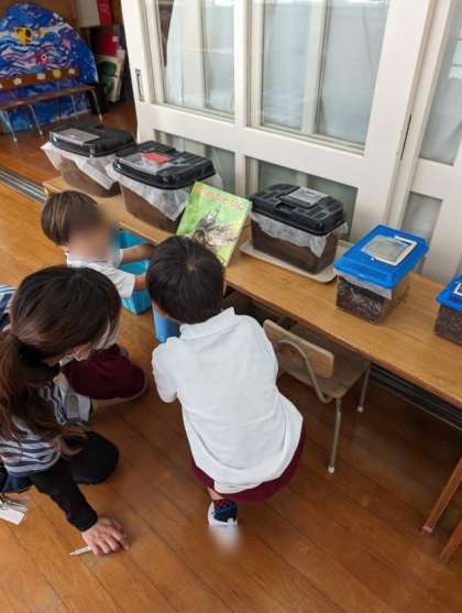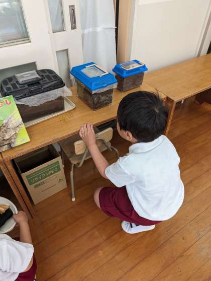 カブトムシの幼虫がサナギになっていました。朝一番に気づいた子どもが先生や友達に知らせてまわっていました。無事にカブトムシになりますように!