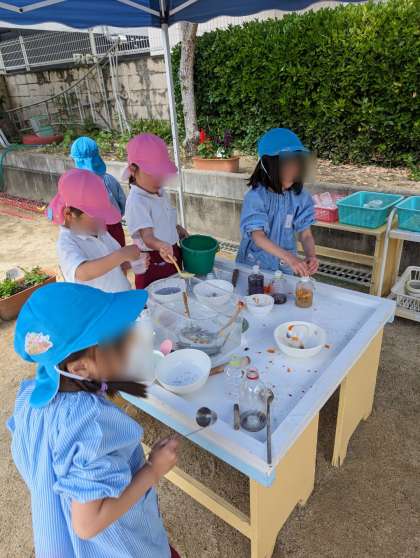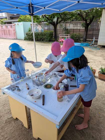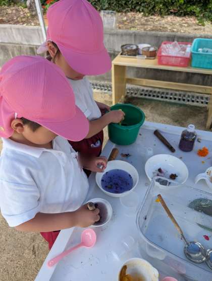 お花を使って色水づくり。繰り返すなかで、少しずつしっかりと色が出るようになってきました。キレイな色のジュースができました♪