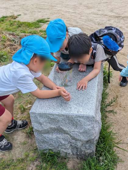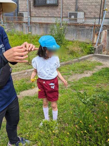 花を摘んだり、虫探しをしたりもできました。チョウを追いかけたり、捕まえたバッタをじっくり見たりして楽しみました。