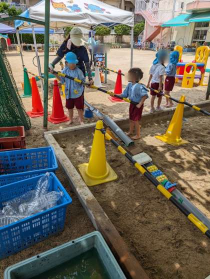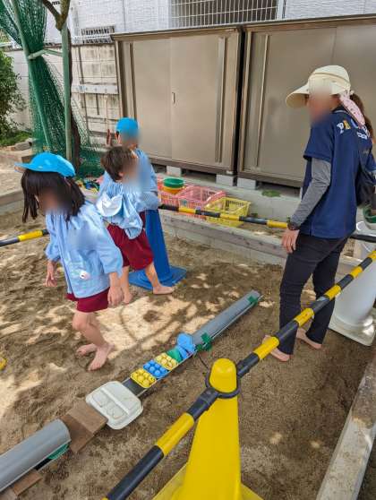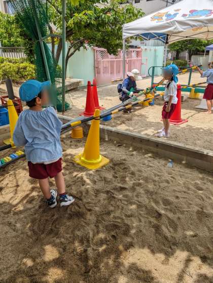 せっかく完成した長い道。片付けの時間になりましたが壊すのがもったいないと話し合い、明日も続きができるよう残すことになりました。壊されないためにどうしたらいいかを考えて、カラーコーンを使って囲むことになりました。明日も沢山遊びましょうね。