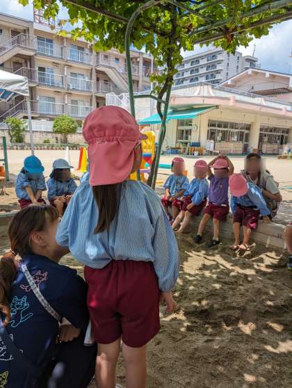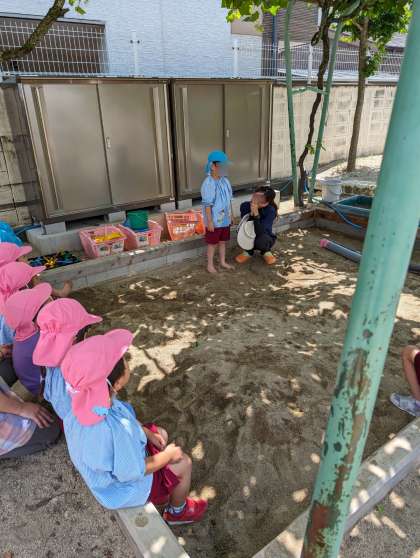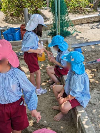 片付けのあとみんなで集まって、今日したこと、工夫したことなどを振り返りました。「なかなか水が流れなかったけど、最後まで頑張ったらいけた」「ジュース屋さんで紫のジュースつくれた」などみんなに教えてくれました。