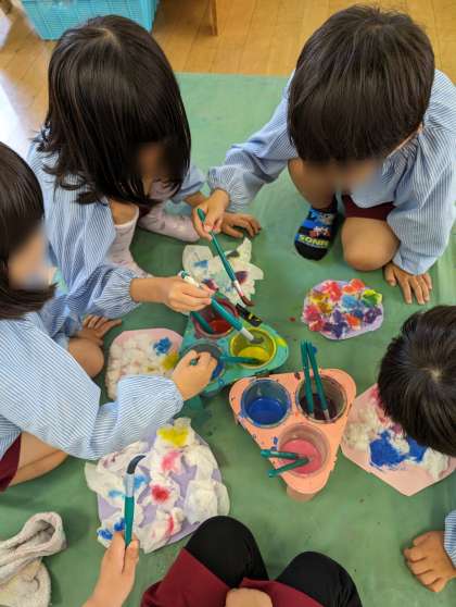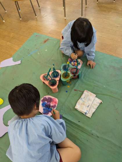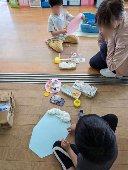 そら組さんがアジサイをつくっていました。絵の具が滲んでいくことでアジサイの花のようになっていました。
