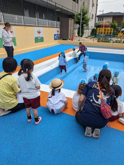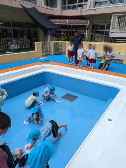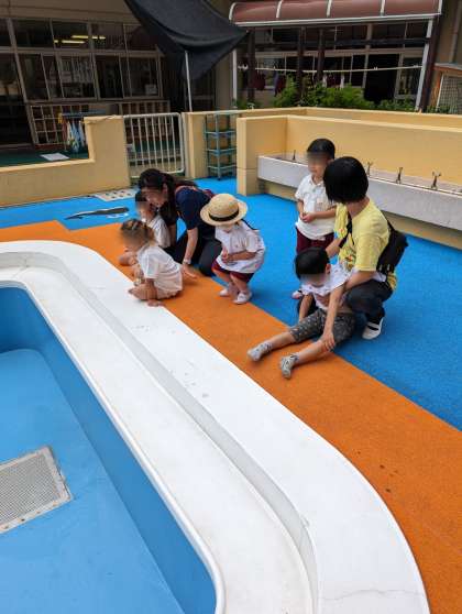 そら組の掃除をもも組さんが見に来ました。もも組さんもプール楽しみですね!みんなで掃除をしてくれているそら組さんにお礼をいいました。