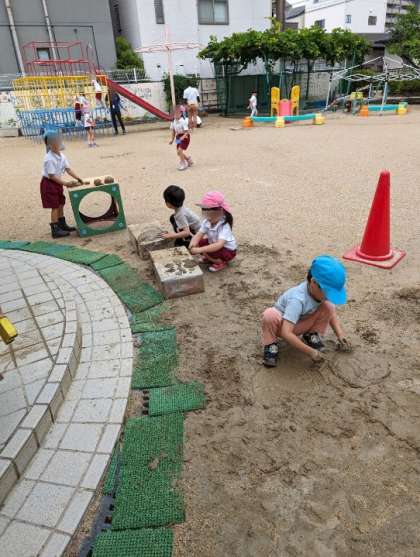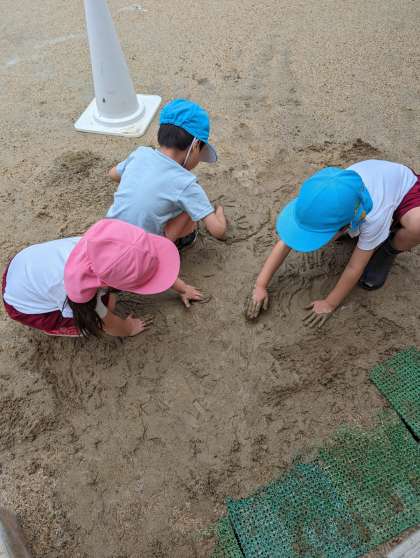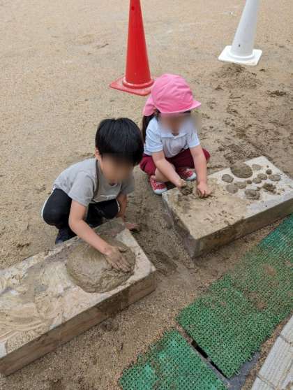 「ぬるっとしてるのがいいねん」と嬉しそうに固めたり、押してみたり、、砂との感触の違いに気づく様子も見られました。