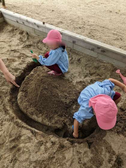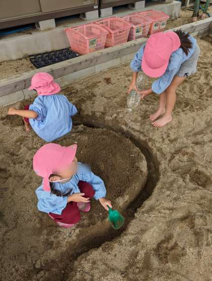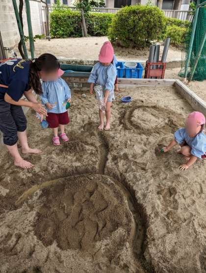 スコップで道を作っていると、どんどんつながっていきました。つながった道に水を流してその流れを見て「ここまで流れた!」「またつながった」と嬉しそうでした!