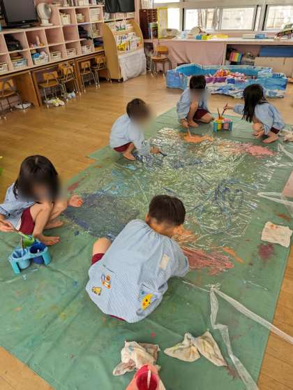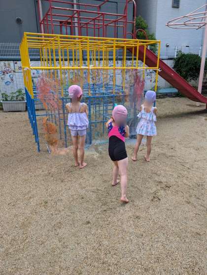 朝の雨が嘘のようにいい天気!水着を着て水遊びをしました。そら組さんが絵の具でかいてくれた的に向かって水鉄砲も楽しみました!