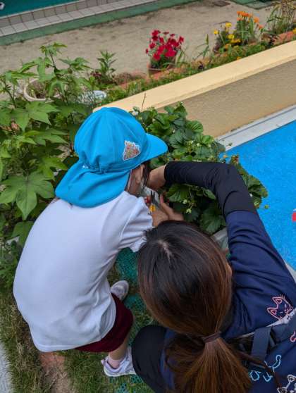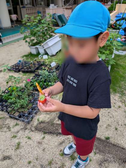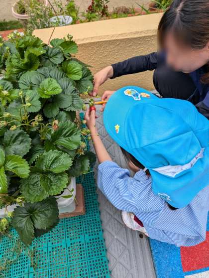 いちごが沢山赤くなっていました。そら組さんが一つずつ収穫していきました。お土産ができたね♪まだまだ赤ちゃんのいちごも大きく赤くなりますように。
