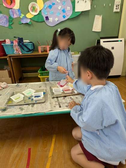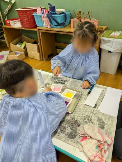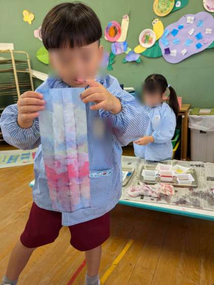 もも組が染紙をしていました。折った紙をそっと絵の具につけてから、その紙を開くと、、、きれいな模様ができていました。「ハートができた」「次は黄色にしよう!色が混ざった!」と楽しそうに繰り返ししていました。