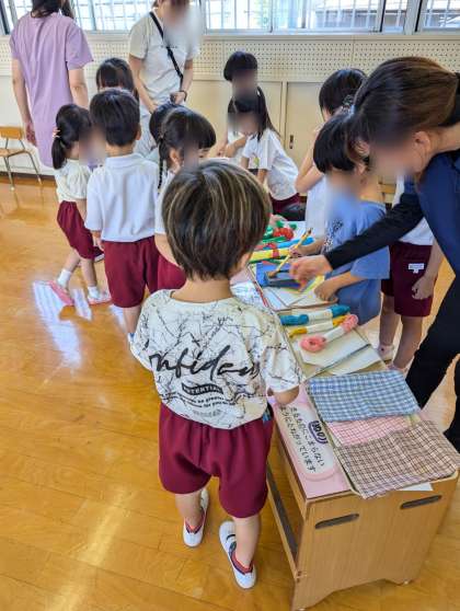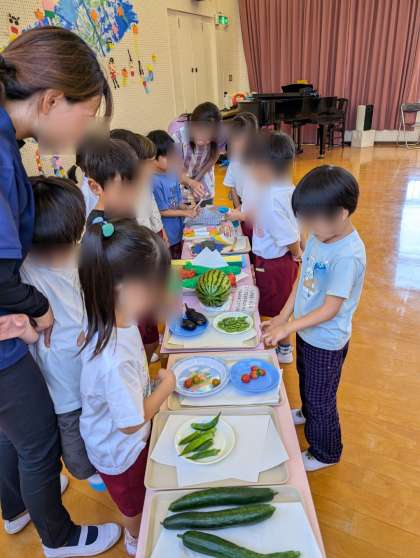 最後にみんなでじっくりとお供えを見ました。「(オクラ)なんかふわふわや」「(筆をもって)字をかくやつ!」と興味をもって見ていました。