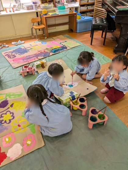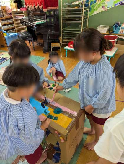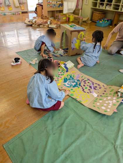 もも組さんがずっと楽しんでいる段ボール迷路の壁に絵をかきたい!色ぬりたい!と楽しくお絵かきをしていました。とてもカラフルできれいな壁がたくさんできました。