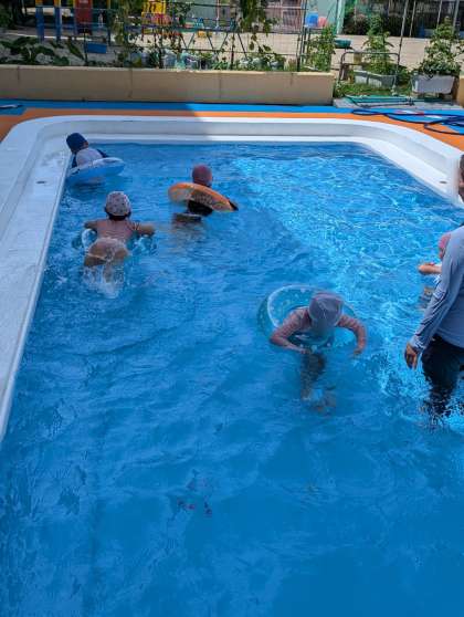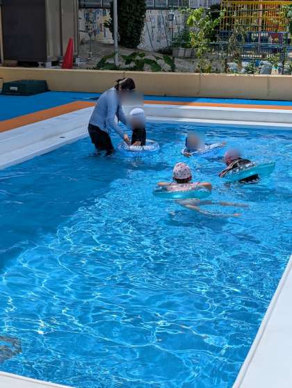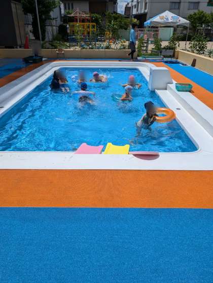 小学校のプールに行った次の日には幼稚園のプールの水も満水に!でも子どもたちは楽しそうに遊んでいました。水と仲良くなってきています。たくましく成長していますね。
