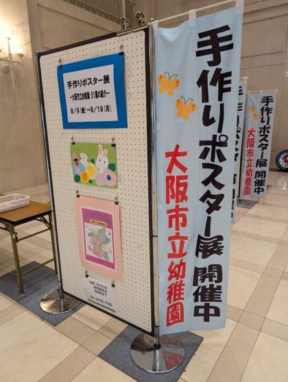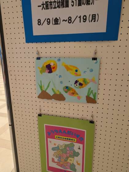 今日から19日まで大阪市役所のロビーに大阪市51園の手作りポスター展が開催されています。今回はもも組さんがつくってくれたお魚の飾りもあります。
