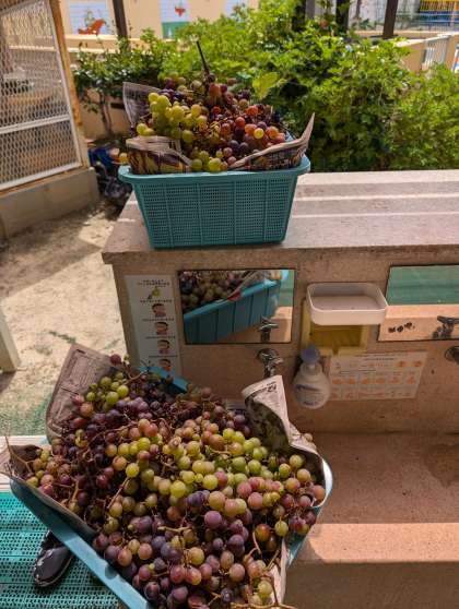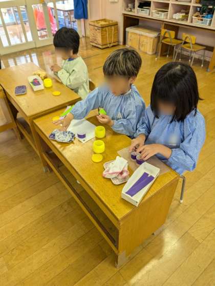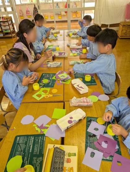 毎日沢山のブドウを収穫しています。子どもたちもブドウの製作を楽しみました。色や形をみながら作りました。