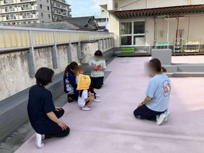 今日は大阪880万人避難訓練でした。預かりに参加しているこどもたちと園の屋上へと避難しました。落ち着いて参加することができました。