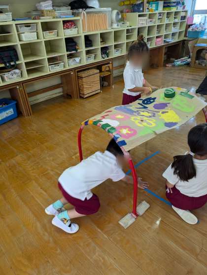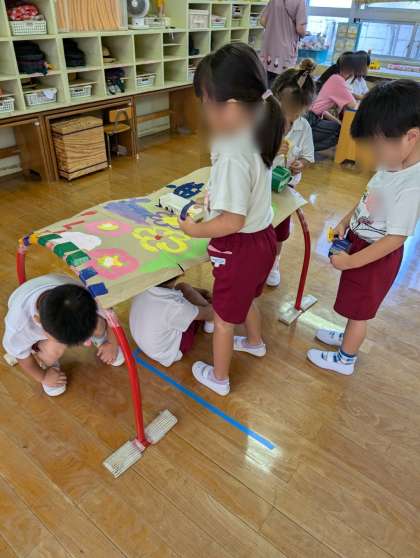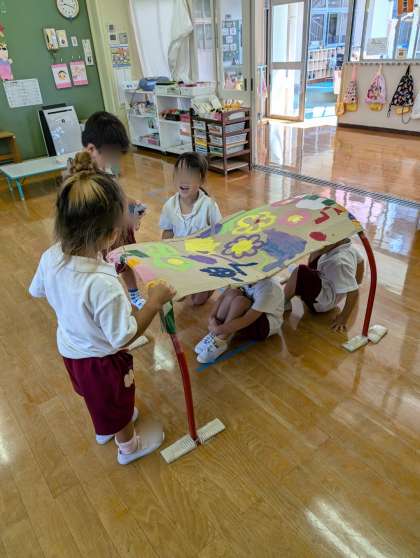 もも組も忍者修行中。隠れ身の術のために、隠れる場所を考えていました。みんなで考えて、一緒につくっている姿がとても楽しそうでした。