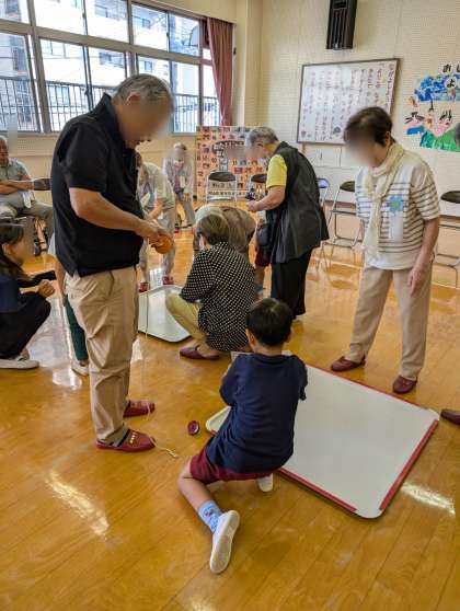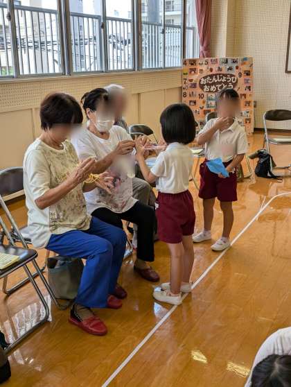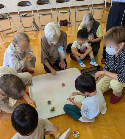 13日に敬老の日の集いをしました。こどもたちのおじい様やおばあ様、地域の方が来てくださって一緒に遊びました。折り紙や、お手玉、こまなどを教えていただきました。