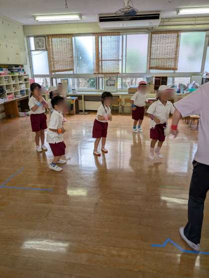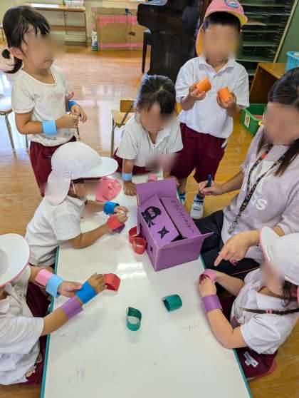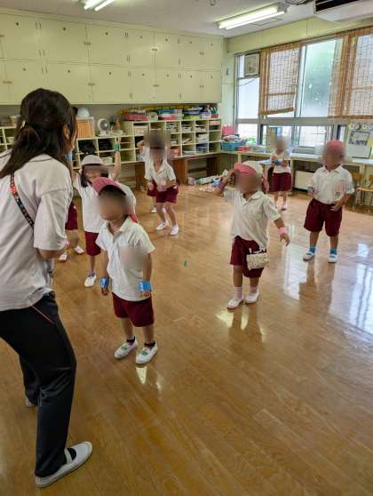 サーキットの忍者修行を終えてリズム室から保育室に戻ってくると、、、なんと!忍者からのプレゼントが!!頑張っているもも組さんに素適なリストバンドが届きました。早速それをつけて、更に忍者の修行(ダンス)をしました。手裏剣をよけるのもバッチリです!