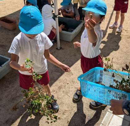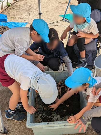 そら組が落花生を収穫しました。殻を割って見て中を見てびっくり。「わあ!種や!!」硬い中身は種に見えたようです。みんな楽しそうに収穫していました。