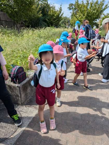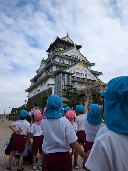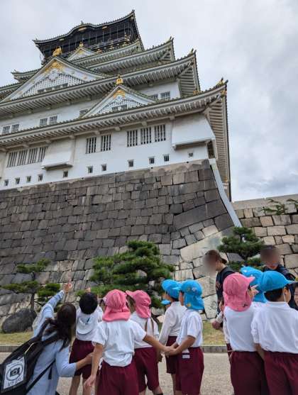 途中で草を摘んで遊んだりもしながら、お城に近づいてきました。大きなお城を見上げていきました。なんとお城の中に忍者が見えた(らしい)子どももいたようです。
