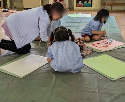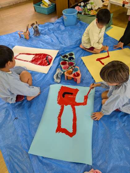 早速、消防車の絵をかきました。「消防車かっこよかったね」「ホースあった!」「はしごが乗ってたよ」と思い出しながらかいていました。