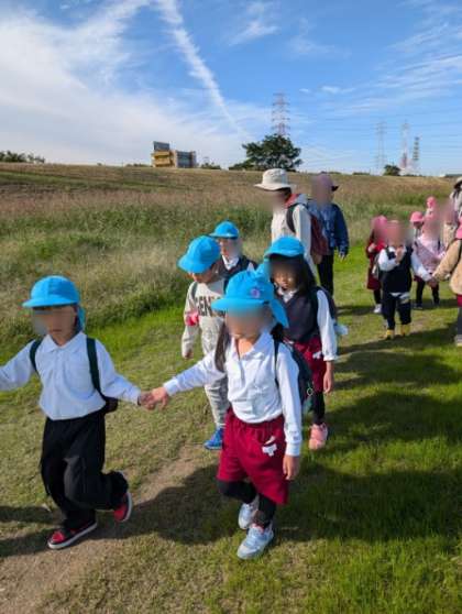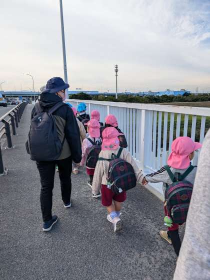 大和川に園外保育に行きました。朝は寒さが気になりましたが、ポカポカのいい天気になりました。みんな足が強くなってきていて、しっかりと歩いて行くことができました。