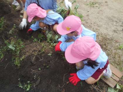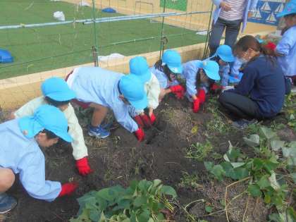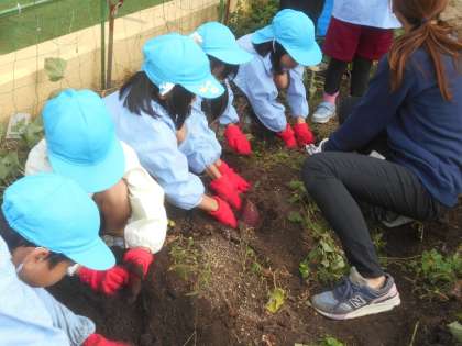 「こっちは丸くて大きいから重い」「こっちは細いから軽い」と採れたおいもを比べたりして、サツマイモの収穫を楽しみました。