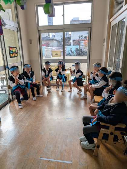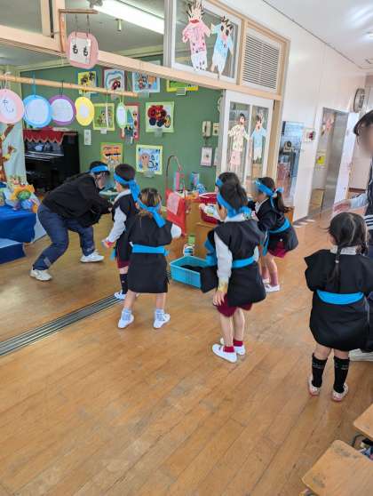 幼稚園に忍者がきてくれました!はじめはお家の方と忍者の修行を、、、。その間に子どもたちはそら組忍者ともも組忍者に変身!!始まる前から忍者になりきってワクワクです。