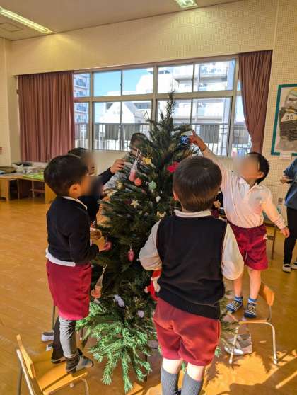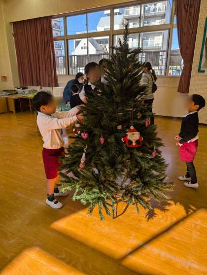 12月に入り、子どもたちと一緒にツリーを飾りました。キラキラな飾りを見て「わー!きれい!」「これ可愛い」と子どもたちの表情もキラキラ!みんなで飾っていきました。