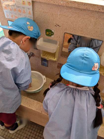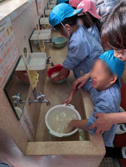みんなでもち米洗いをしました。お水を入れて、手のひらでギュッギュッと押しながら洗っていきました。真っ白な水が少しずつ澄んでくるのを見ながら、お米をこぼさないように丁寧に洗っていました。