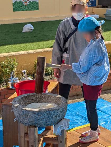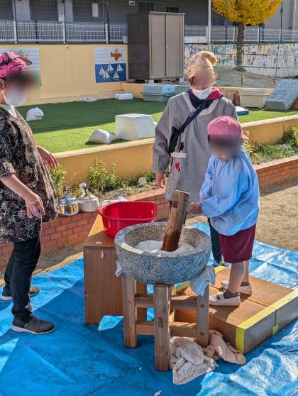 2臼目は子どもたちの出番です!順番に交代しながらついていきました。「(杵)全然重たくなかったで!」「まだおもちになってないなあ」と頑張ってついていました。
