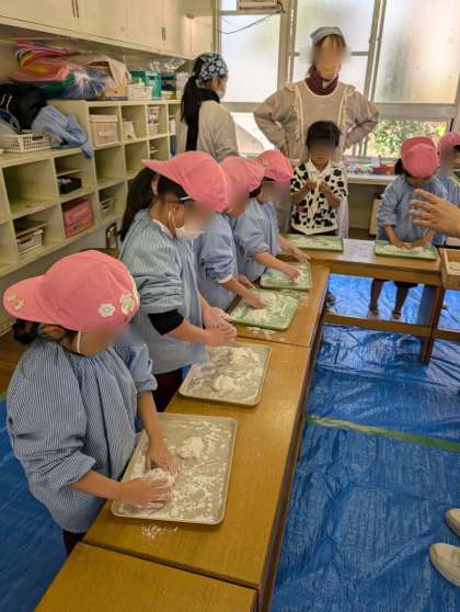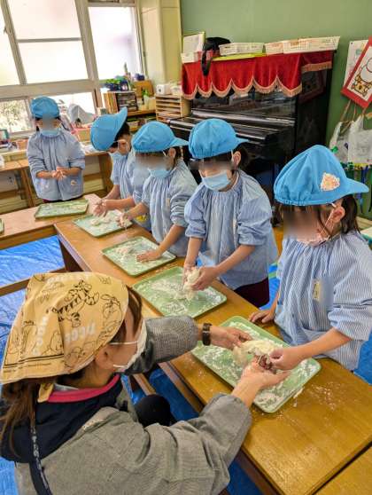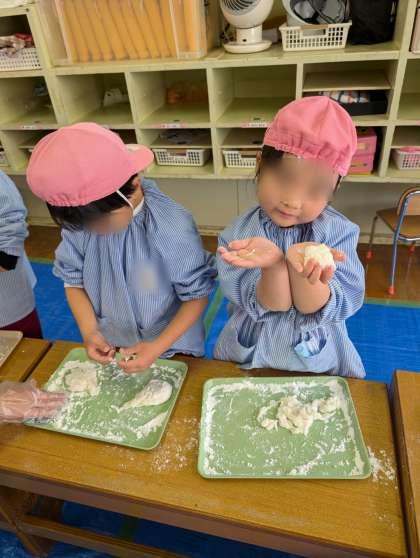 できたおもちを丸めて、ミニミニ鏡餅を作っていきました。「やわらかいな」「ふわふわしてる」みんなかわいいミニミニ鏡餅が作れました。
