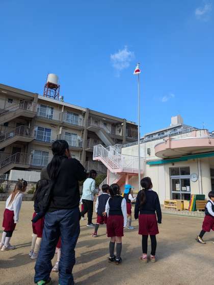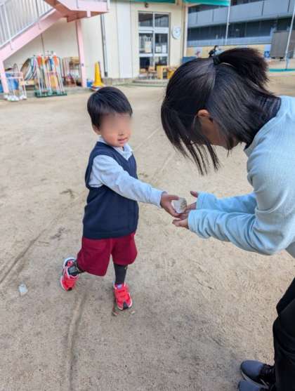 サンタさんが帰ったあと、お庭には氷が落ちていて、ソリのあとがありました!子どもたちは、大興奮。ソリの跡にそって走ったり、氷を拾ったりしていました。「(この氷)サンタさんの落とし物や!」と大喜び、空に向かってサンタさんを呼んでいました。