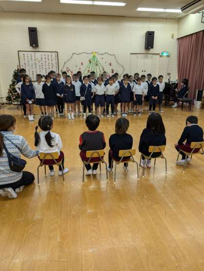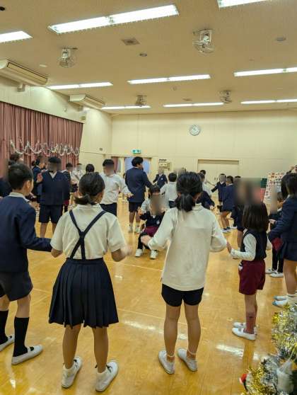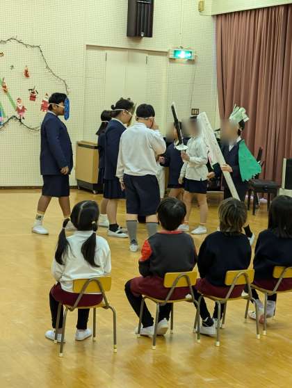 長吉小学校の4年生が幼稚園に来てくれました。2組はそら組さんと交流。すてきな歌声を聴かせてくれたり、桃太郎の劇あそびを見せてくれたりしました。最後に、サンタッタを一緒にしました。子どもたちも「また来てな!」と嬉しそうでした。
