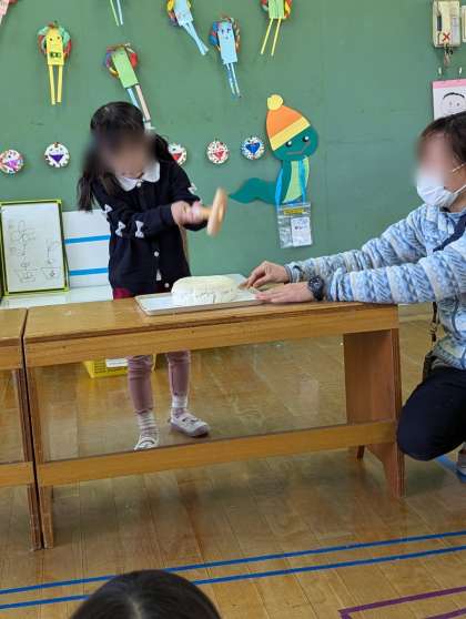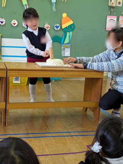 お昼からは鏡開きをしました。先生に鏡餅を飾る意味を聞いた後は、木槌で開いていきました。固いおもち、みんなで交代で頑張りました!