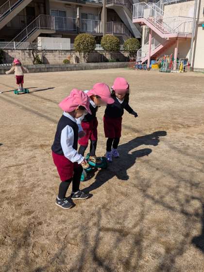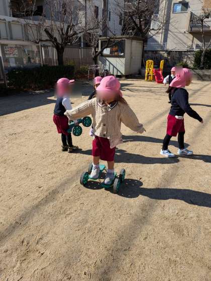 もも組さんはアオムシのペダルローラーにチャレンジ中。バランスをとって少しずつ進んでいきます。得意になって1人でスイスイ進めるようになったり、友達の手をもって、乗れるように手伝ったりと協力しながら一緒に楽しんでいます。