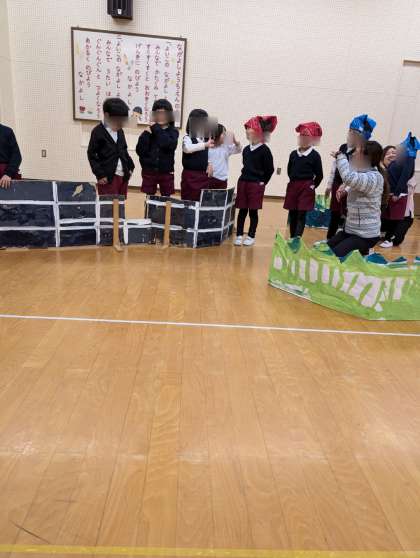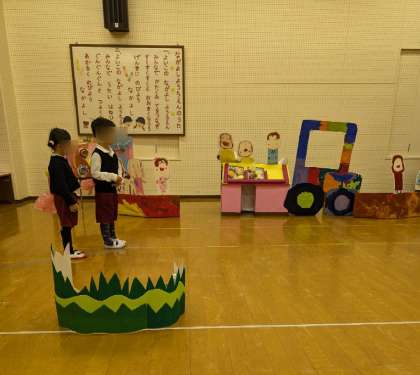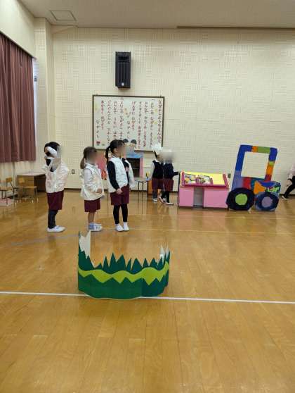 少しずつ小道具や衣装ができてきています。衣装をつけることで、更にお話の世界に入り、役になりきって楽しんでいます。広いリズム室でするとちょっとドキドキもしているようですがみんなが楽しんでできるようにすすめていきたいと思っています。