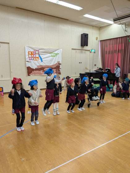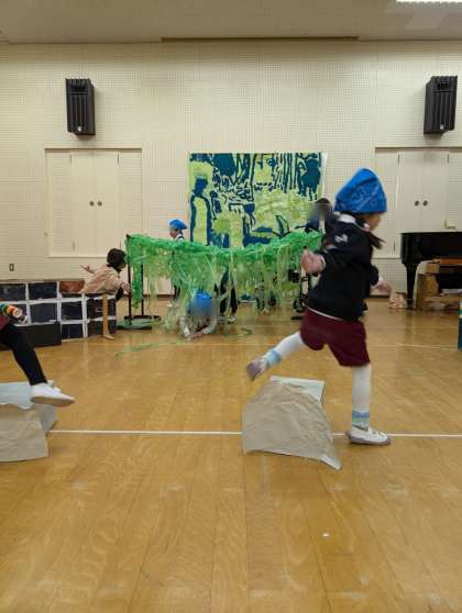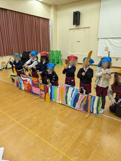 そら組もわんぱく団になりきって劇あそびをしていました。1人で言うセリフもドキドキしながらも一生懸命頑張っています。かっこいいです!明日一番かっこいい、すてきなそら組わんぱく団を見てもらえたらうれしいですね!