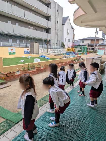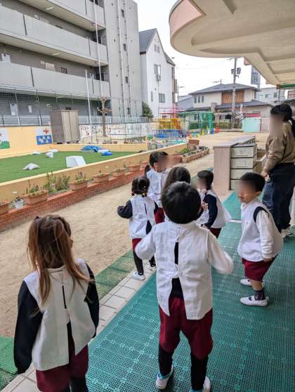 お昼に雪がパラパラと降りました。それに気づいたもも組さん、みんなでテラスにでてきて大喜び!自然に「ゆーきのこぼうず ゆーきのこぼうずやーねーに お、り、た♪」とみんなで大合唱がはじまりました。とっても寒かったけれど、とっても楽しそうなかわいい時間でした。