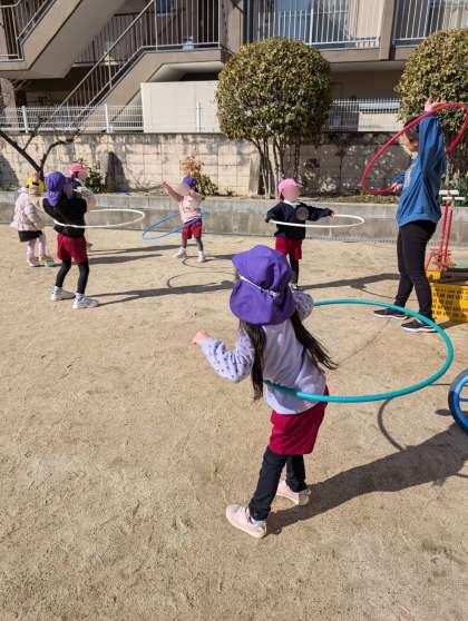 長吉第二幼稚園のすみれ組のお友達が遊びに来てくれました。今日で、会うのは2度目の子どもたち。長吉第二幼稚園のお友達が到着するのを、まだかまだかと心待ちにしていました。久しぶりに会うことができて、とても嬉しそうでした。幼稚園の園庭で、一緒に鬼ごっこをしたり、ホッピングなどをしたりして遊びました。その後、リズム室で発表会の歌をききあったり、ふれあい遊びをしたりして楽しく過ごしました。