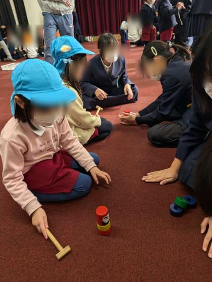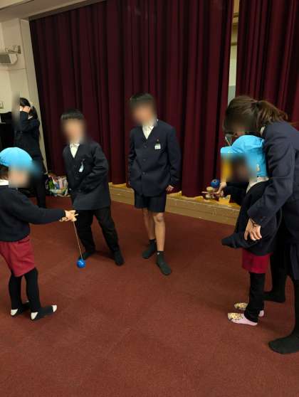 川辺小学校の5年生との交流をしました。けん玉やあやとり、だるま落とし、ヨーヨーなどの遊びを教えてもらいました。優しくやり方を教えてもらって