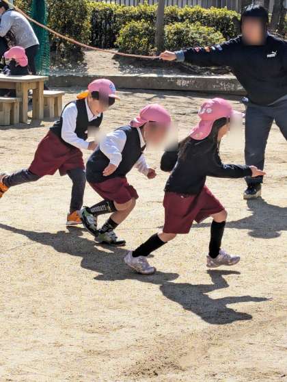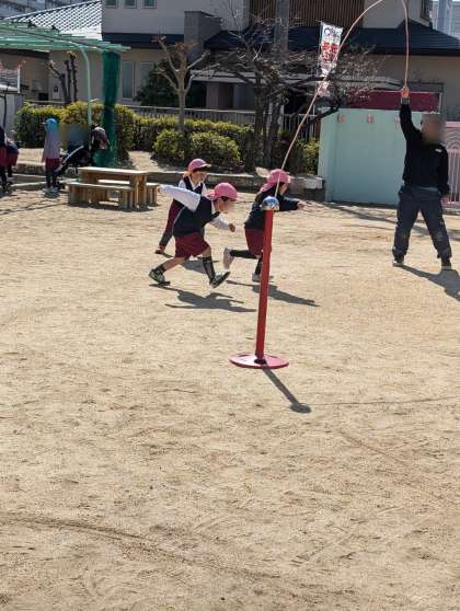 長なわくぐり! 公開日 2025/02/26 更新日 2025/02/26 子どもの姿 もも組さんが長なわくぐりにチャレンジ!タイミングを見て、合図をきいてひっかからないようにくぐっていました。繰り返し楽しそうに走っていました。 いいね(0)