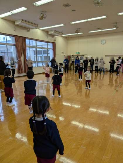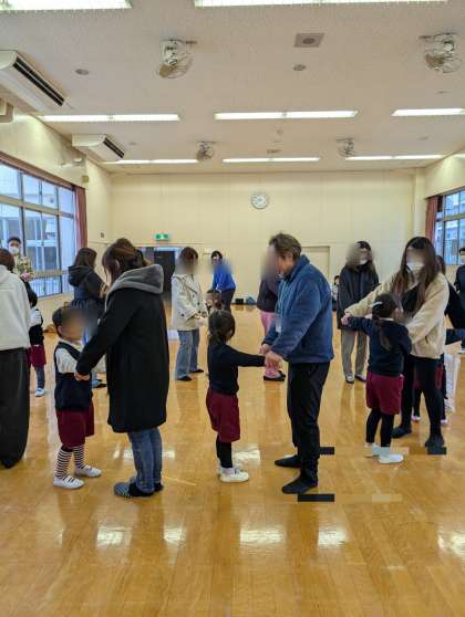 5日は保育参加でした。はじめにみんなで「らららでこんにちは」で遊びました。1.2.3の合図でくるっと振り返り、どんどん違うペアになっていくのを楽しみました。最後にもとのお家の方とのペアにもどってきて大喜びでした。ラーメン体操も元気いっぱい楽しみました。