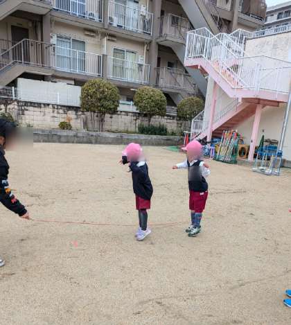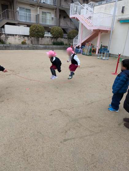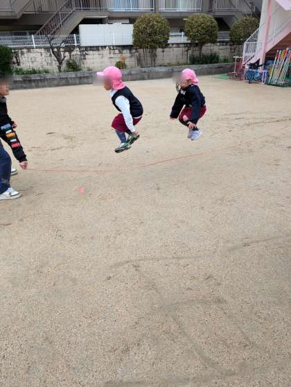 郵便屋さんの長縄にチャレンジ!2人一緒に跳んでいました!!すごい!いい笑顔で繰り返ししていました。