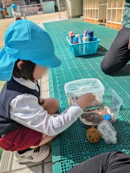 暖かくなってきて、カナヘビさんも日向ぼっこです。子どもたちが「カナヘビさんにあげる」と桜の花びらやカタバミをいれてくれました。カナヘビのお家にも春がきたみたいですね♪