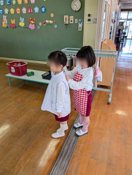 朝の用意のお手伝い 公開日 2025/04/11 更新日 2025/04/11 子どもの姿 今日からもも組さんも登園です。そら組さんがもも組のお部屋で朝の用意のお手伝いをしてくれました。とっても優しいお姉さんでした。 いいね(0)