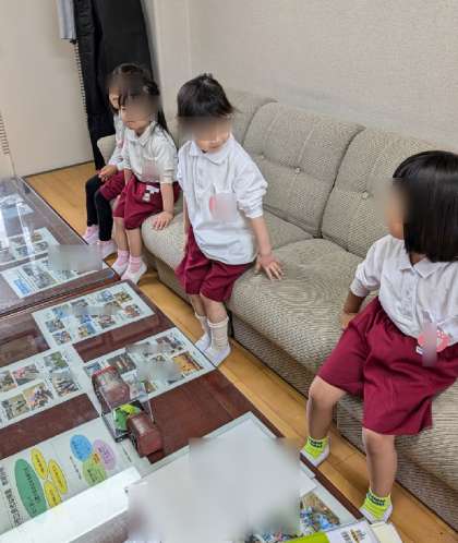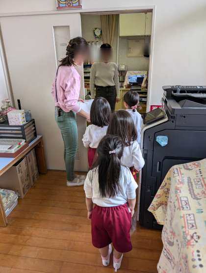 朝の用意のあとは、そら組もも組もみんなで養護教諭にお休み調べをもっていきました。もも組さんはその後園長室にも入りました。「園長先生のお部屋だよ〜」と聞きながら興味津々の様子でした。