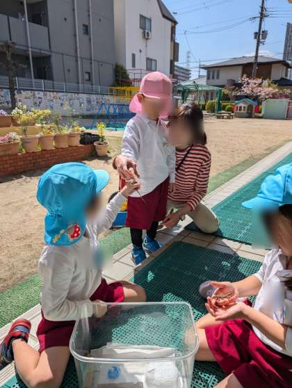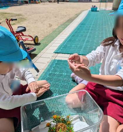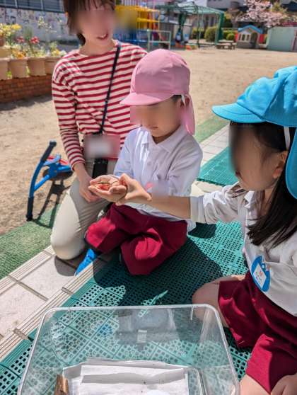 今日もそら組さんがカナヘビを手に乗せてふれあっていました。そこにやって来たもも組さん。興味はあるけれど、ちょっと怖いかな?