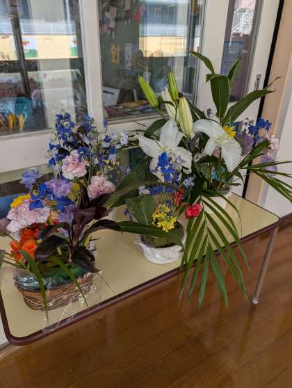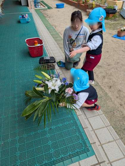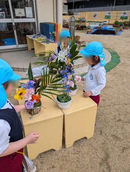 入園式の時のお花や、園庭のお花で生け花をしました。「このお花きれい!」「そら組だから青色の花にしたよ」と自分なりに花を選んで生けていきました。大人ではできない唯一の素敵な生け花になりました!