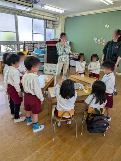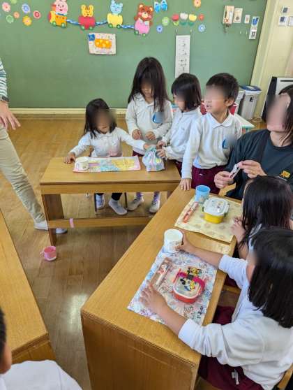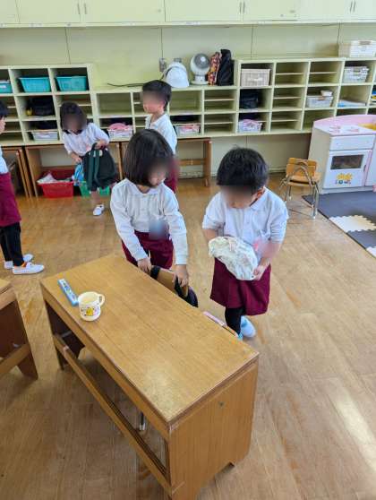 今日から、もも組さんもお弁当が始まりました。そら組さんがお手伝いマンでお弁当の用意のお手伝いに来てくれました。「何を出したらいいのかな」「どこに置いたらいいのかな」など色々なことを優しく教えてくれたり、手伝ってくれたりしていました。そら組さんありがとうこざいました!