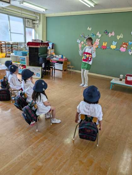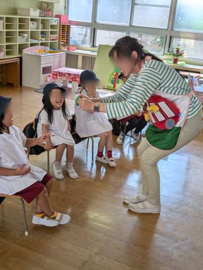 お弁当バスのエプロンシアター。とても嬉しそうに笑いながら見ていました。昨日みた絵本のエプロンシアターだったので「次は◯◯が来る!」「まだ全員(バスに)乗ってない!」とストーリを思い出しながら見ていました。